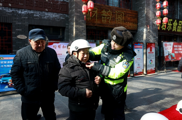 志愿者指导市民正确佩戴安全头盔。陈刚摄