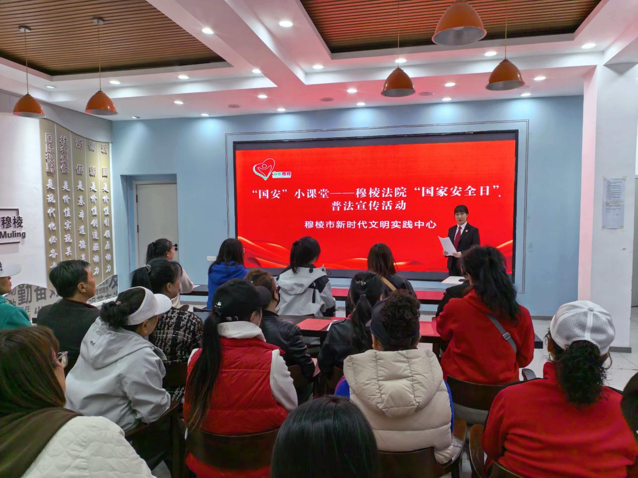 在新时代文明实践中心,穆棱市人民法院开展了“法律七进”普法活动。活动现场,干警们通过发放普法手册、讲解典型案例、播放普法短片、现场答疑解惑等形式,普及国家安全法、网络安全法等法律知识,并针对群众关心的电信诈骗、个人信息保护等民生热点以案释法,详细讲解危害国家安全行为的识别、防范知识及举报渠道,实现国家安全教育与民生普法深度融合。