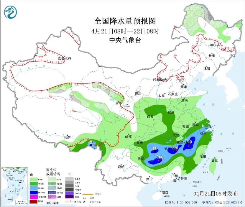 中央气象台今晨继续发布暴雨黄色预警:预计今天,重庆东南部、贵州东部、湖南中南部、江西中北部、安徽南部、浙江西部和北部、福建西部、上海南部、广西东北部等地部分地区有大到暴雨,湖南中部、江西中部、广西东北部等地局地有大暴雨(100~140毫米);上述部分地区伴有短时强降水(最大小时降雨量20~40毫米,局地可超过50毫米),局地有雷暴大风或冰雹等强对流天气。另外,西北地区东南部、黄淮、江淮等地部分地区有小到中雨,其中内蒙古东北部和黑龙江西北部等地部分地区有小到中雪或雨夹雪。