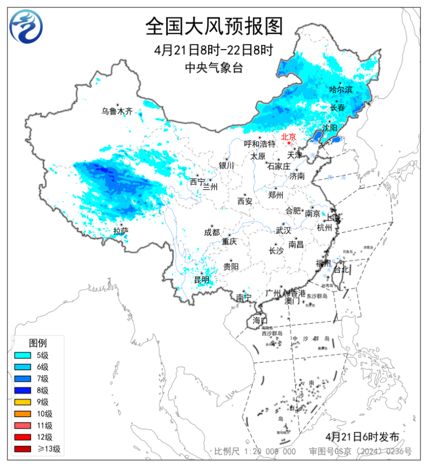中央气象台今晨继续发布大风蓝色预警:预计今天,内蒙古中东部、黑龙江中南部、吉林、辽宁以及新疆南疆盆地、西藏北部、青海西部等地部分地区有5~7级风,阵风8~9级,渤海北部海域、黄海北部海域有7级风、阵风8级。