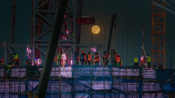 月色下工作的冰建工人。图片由哈尔滨冰雪大世界提供