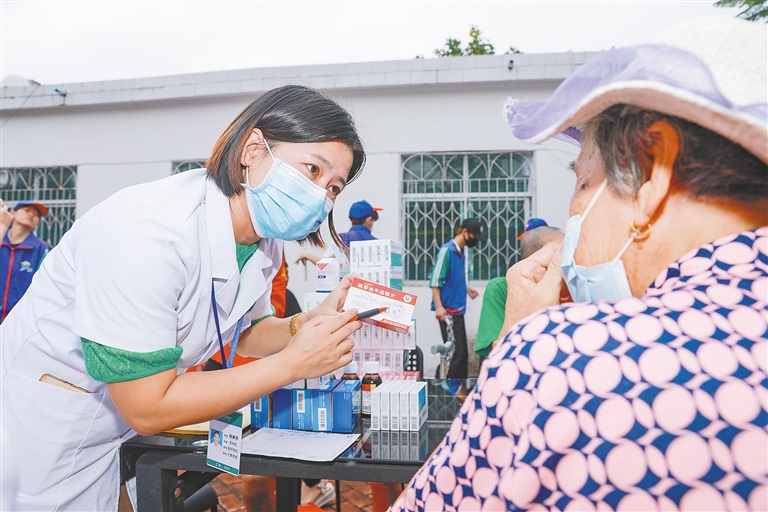 万宁开展“重阳敬老·党员先行”活动。图为万宁市人民医院医生为龙滚镇敬老院老人介绍健康知识。海南日报全媒体记者 袁琛 摄