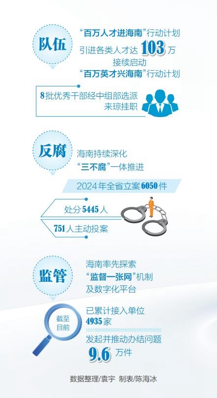 近年来,海南持续深化“三不腐”一体推进,不敢腐的震慑持续强化,始终保持高压反腐态势,2024年全省立案6050件,处分5445人,751人主动投案;不能腐的笼子越扎越牢,建设公共工程“监督一张网”,全面推行“机器管招投标”,探索项目建设“全流程”机器监督监管,从源头防治腐败;不想腐的堤坝不断构筑,常态化开展新提拔干部“家庭式”廉政谈话会,加强市场主体廉洁教育,分级分层抓好年轻干部廉政教育,筑牢思想防线。