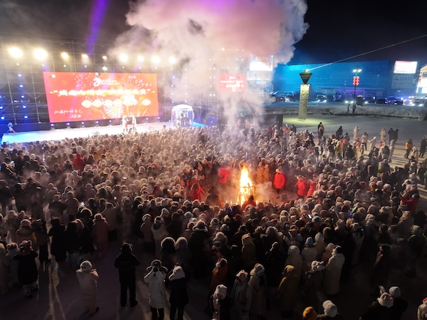 祈福舞蹈后,熊熊篝火被点燃,市民游客围着篝火尽情舞动,在冰天雪地中释放热情与活力,共同迎接2026年的到来。在零点钟声敲响的瞬间,绚丽的烟花在北极星广场上空绽放,光影与地上的篝火相映成趣,将活动推向高潮。