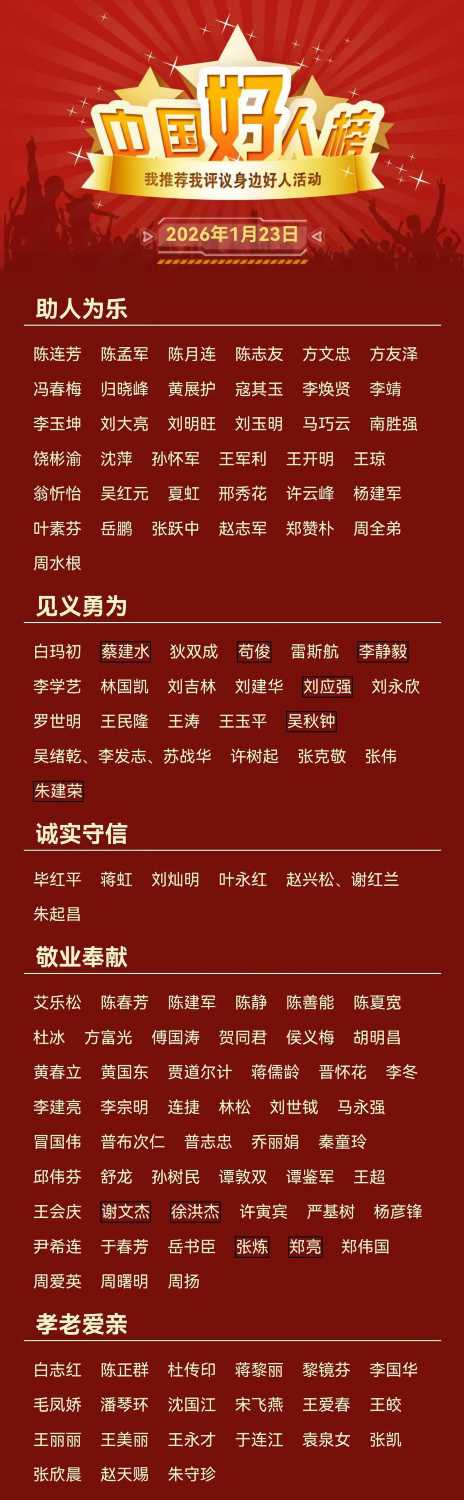 1月23日下午,2025年第四次“中国好人榜”发布仪式暨全国道德模范与身边好人现场交流活动在四川宜宾举办。经各地推荐、网友评议和专家评审等环节,共有139人(组)助人为乐、见义勇为、诚实守信、敬业奉献、孝老爱亲身边好人光荣上榜。其中,山东省共有11人入选!