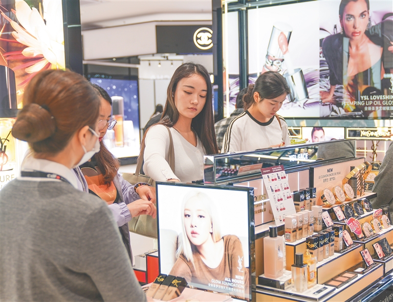 中免集团近期推出“十二重礼”福利,并投入1.218亿元礼券于全岛发放。在这些促销举措的助推下,海南离岛免税的消费活力得到进一步释放。图为12月21日,消费者在cdf海口日月广场免税店选购免税品。