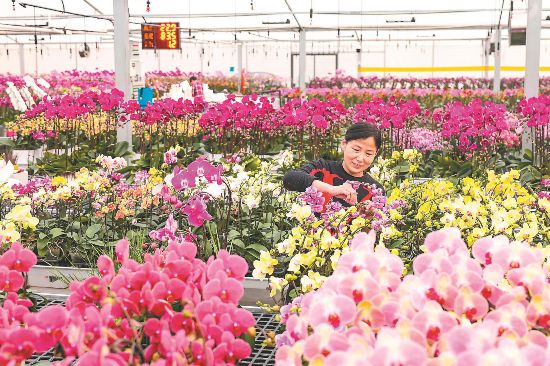 1月6日,肥西县上派镇彭圩村兰君园艺基地,工作人员在整理年宵花蝴蝶兰。兰君园艺蝴蝶兰种植基地的智能化温室大棚内,25万余株各色蝴蝶兰争奇斗艳,60万株花苗旺盛生长,迎来年宵花销售旺季。