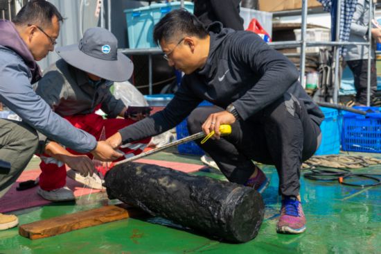 水下考古队员在测量刚出水的“靖远”舰21厘米克虏伯炮弹。