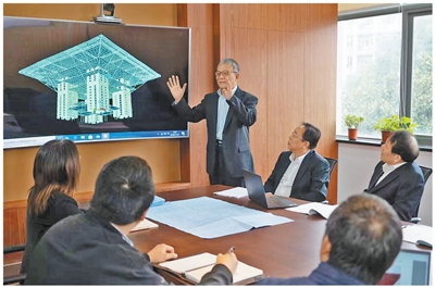 吕西林(中)带领团队设计抗震方案。 |