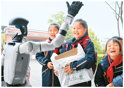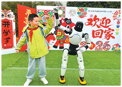 近日,湖南省长沙市开福区新竹第二小学以“AI科技+教育”的方式迎来春季开学,智能机器人走进校园,与学生面对面互动。 郭立亮摄(人民视觉)